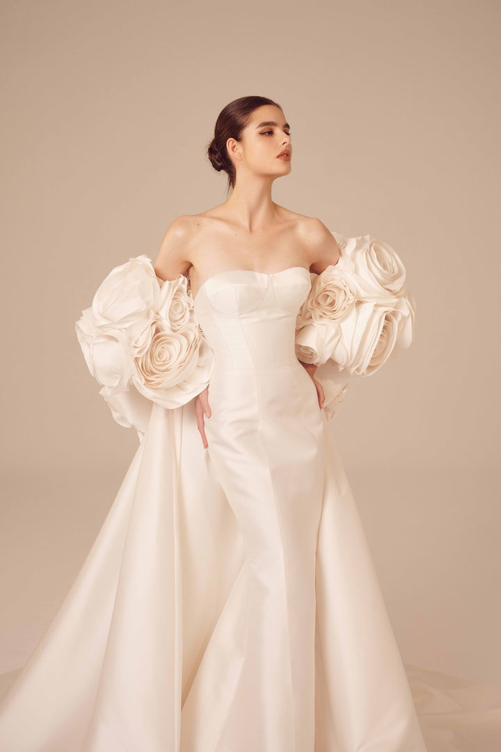 This exquisite mikado mermaid dress by designer Nicole Felicia embodies sophistication and unique elegance. Featuring a sleek silhouette that enhances the wearer’s figure, it is elevated by a stunning rosette cape that cascades into a long, dramatic train. This statement piece combines classic design with bold artistry, making it a truly one-of-a-kind gown perfect for brides seeking unparalleled grace and unforgettable presence on their special day. The luxurious fabric and meticulous craftsmanship ensure both comfort and style, creating a timeless look that captivates from every angle.